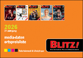 Die MEDIADATEN unserer BLITZ! Veranstaltungsmagazine bieten wir hier als „.pdf“ Datei zum Abrufen an. Bitte zum Betrachten auf das Bild klicken. Zum Downloaden der Daten bitte den Link oder das Bild mit der rechten Maustaste anklicken und im erscheinenden Menü „Ziel speichern unter…“ auswählen.